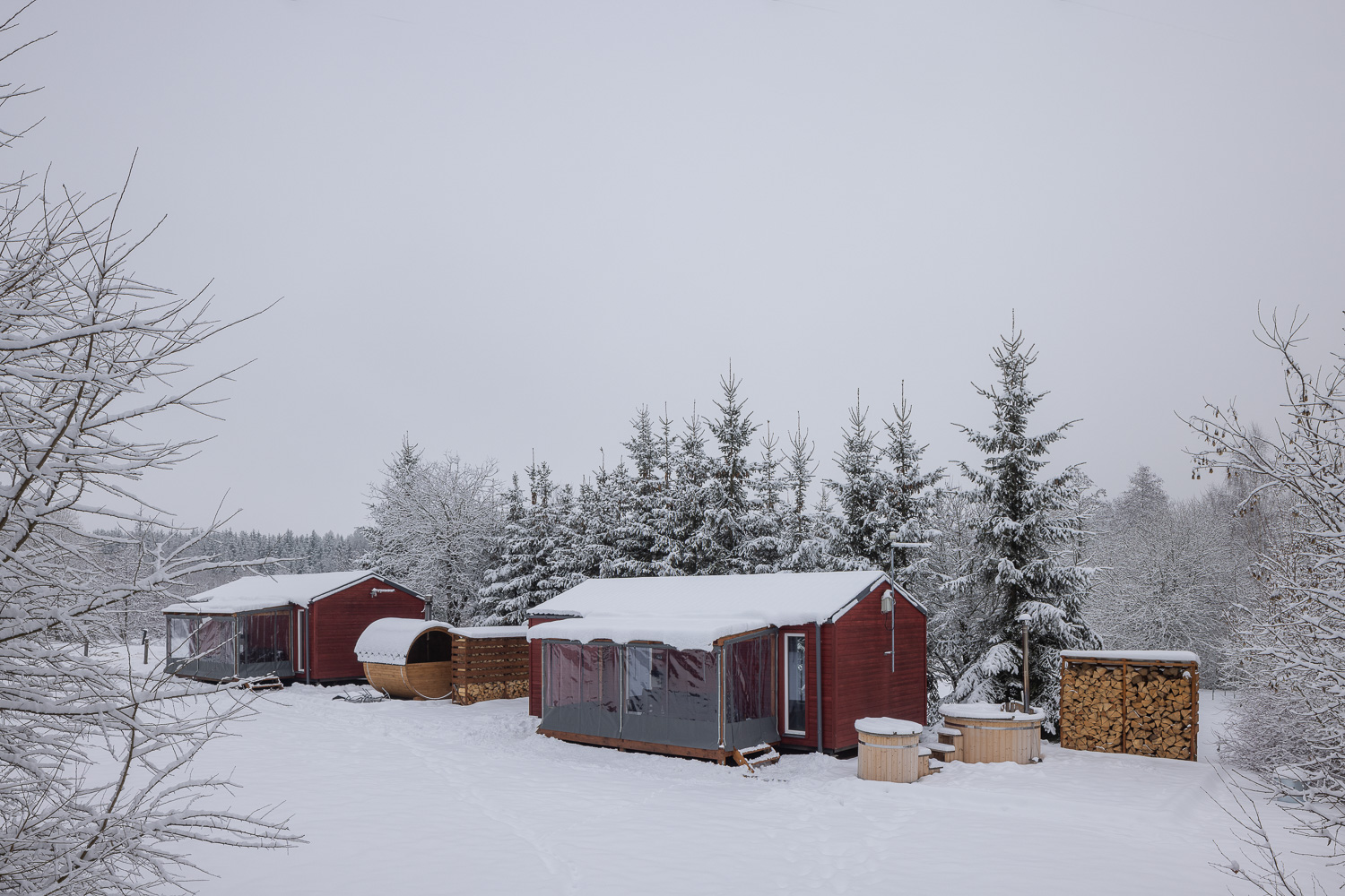 Přímo z chaty vstoupíte na útulnou zastřešenou terasu s posezením a grilem. Vedle budete mít k dispozici horký vířivý sud nebo saunu. Kterou variantu si vyberete? Ať je to jakkoli, dřevo na roztopení budete mít vždy nachystané. Nezapomeňte potom vlézt do ochlazovací kádě.
